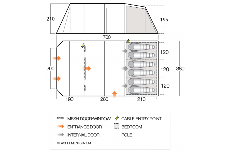 The Vango Stargrove II 600XL, 6-man tent with additional living space and integrated awning provides a large and versatile home from home. The large Diamond Clear Windows let light pour into the living areas during the day and can be covered up with the roll-away toggled curtains at night. The fully sewn-in groundsheet keeps out draughts and bugs, whilst ventilation can be managed using the mesh doors and AirZone panels. At over 2m tall, it’s easy to stand-up and move around. The large front door can be unzipped to the midpoint, or fully across, giving a good variety of options to suit different conditions and uses. You can even sleep-in longer on summer mornings, thanks to the Nightfall bedroom inner tent, designed to minimise the morning light.